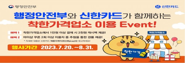 행정안전부와 신한카드사가 함께하는 착한가격업소 이용 활성화를 위한 협업 이벤트를 다음과 같이 알려드립니다.